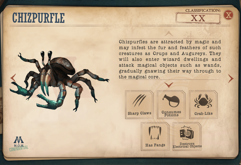 Objetos como caldeirões também são suscetíveis a essa infestação. A magia utilizada para as poções e elixires é frequentemente vulnerável à ação dos chizácaros, que buscam se alimentar das propriedades sobrenaturais liberadas durante o processo de fervura. Este consumo de energia não apenas diminui a eficácia das poções, mas também pode alterar suas composições, resultando em resultados inesperados e, por vezes, perigosos para quem as manipula.